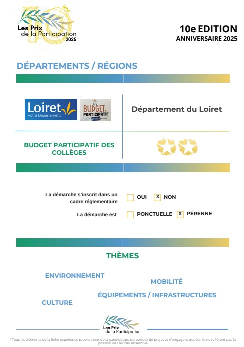 Le Département du Loiret a reçu 2 étoiles lors des Prix de la participation pour son budget participatif des collèges, une démarche qui place les jeunes au cœur de la vie démocratique locale.