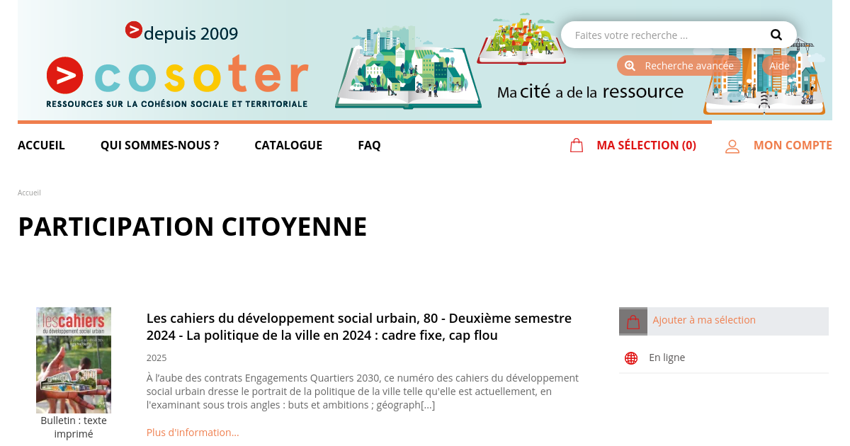 COSOTER est un fond compilé par les centres de ressources politique de la ville. Une présélection de documents numérique est proposée sur les questions d'implication citoyenne.