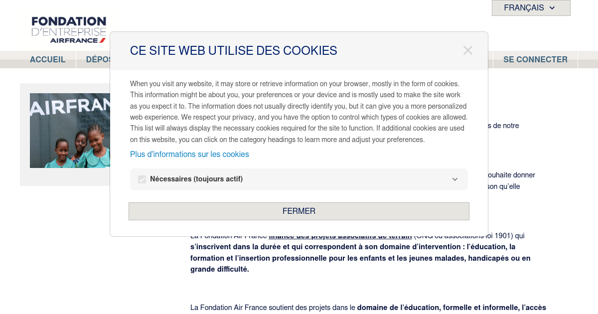 La Fondation Air France finance des projets associatifs de terrain (ONG ou associations loi 1901) qui s’inscrivent dans la durée et qui correspondent à son domaine d’intervention : l’éducation, la formation et l’insertion professionnelle pour les enfants et les jeunes malades, handicapés ou en grande difficulté.