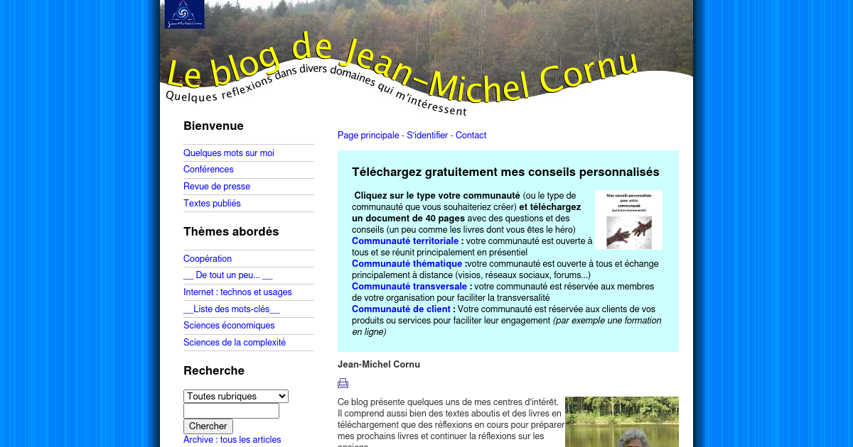 Un blog rassemblant courtes vidéos, livres, articles. Avec beaucoup de ressources pour l'animation de communautés. Jean-Michel Cornu, consultant dans les domaines des stratégies de l'innovation, de la coopération et de l'intelligence collective. Jean-Michel Cornu est consultant dans les domaines des stratégies de l'innovation, de la coopération et de l'intelligence collective.