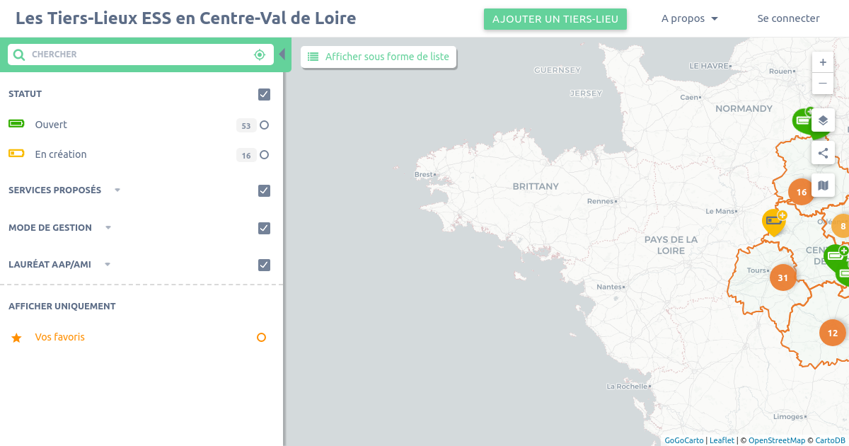 Carte collaborative qui recense les tiers-lieux du Centre-Val de Loire. Par Ambition Tiers Lieux.