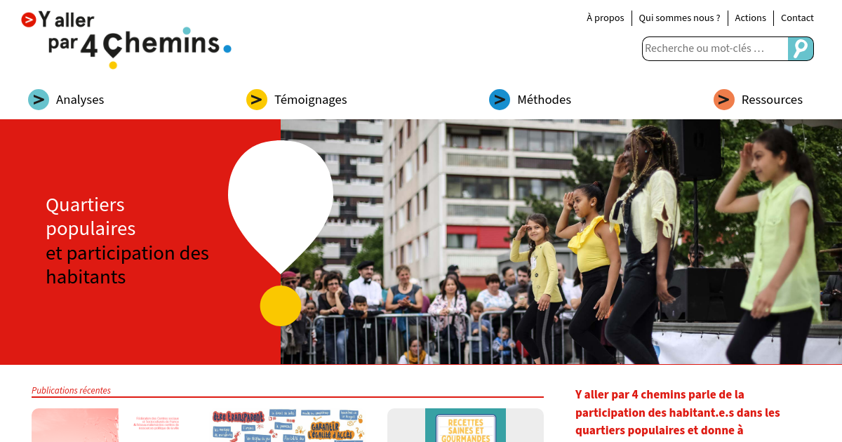 Y aller par 4 chemins parle de la participation des habitant.e.s dans les quartiers populaires et donne à comprendre la façon dont se joue la participation dans ces quartiers. Ce site est piloté par le Réseau national des centres de ressources politique de la ville et propose des démarches, des analyses, des témoignages et des ressources issus d’expériences conduites avec l’appui des centres de ressources.